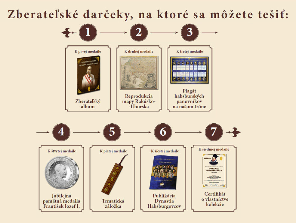 Nová kolekcia Dynastia Habsburgovcov približuje fascinujúci príbeh rodu, ktorý formoval dejiny Európy. Kolekcia podlieha prísnej limitácii – celosvetovo je dostupných len 5000 kompletných kolekcií. Na ďalších pamätných medailách z kolekcie sú vyobrazení významní členovia habsburskej dynastie, ktorí vládli na našom tróne – napríklad Mária Terézia, Jozef II., Ferdinand I. a ďalší.